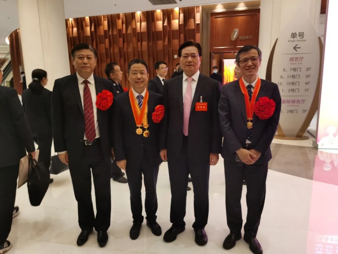 無錫市委書記黃欽(左三)帶領無錫市3名國家級榮譽代表,參加江蘇省新冠肺炎疫情表彰大會,從左至右分別為:“全國抗擊新冠肺炎疫情先進集體”獲得者,無錫市第五人民醫院黨委書記、院長魯曉杰(左一);“全國抗擊新冠肺炎疫情先進個人”“全國優秀共產黨員”兩項榮譽獲得者,紅豆集團黨委書記周海江(左二);“全國抗擊新冠肺炎疫情先進個人”獲得者,無錫市人民醫院副院長、胸外科主任、主任醫師陳靜瑜(右一)。